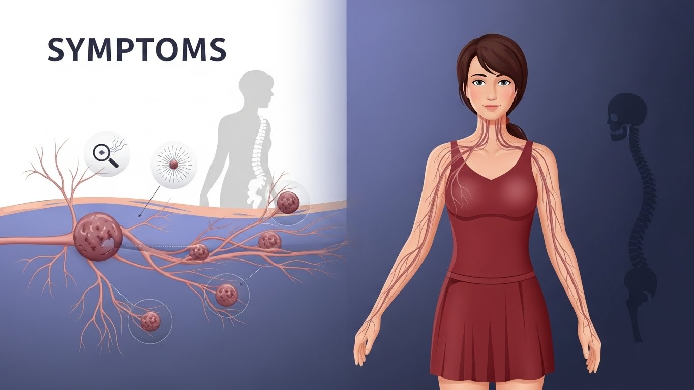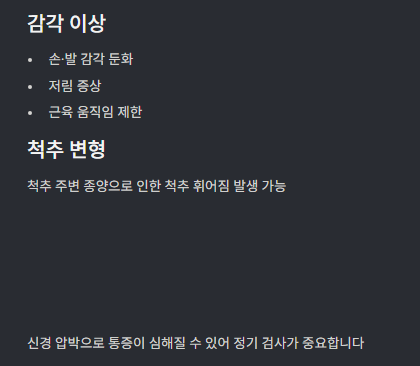 신경에 생긴 혹은 감각과 운동에 영향을 미칩니다. 손이나 발의 감각이 둔해지거나 저림이 느껴질 수 있으며, 근육의 움직임이 제한되는 경우도 있습니다. 척추 주변에 생긴 혹은 척추가 휘는 변형을 만들기도 합니다. 어떤 경우에는 신경 압박으로 인해 통증이 심해질 수 있으므로 정기 검사가 중요합니다.