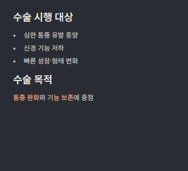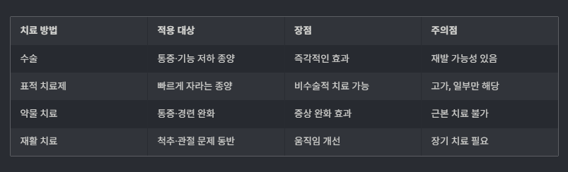 | 수술 | 통증·기능 저하 종양 | 즉각적인 효과 | 재발 가능성 있음 |