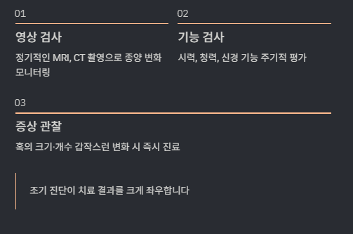 이 질병은 시간이 지나면서 변화하기 때문에 정기적인 MRI, CT 검사가 필요합니다. 시력, 청력, 신경 기능 검사도 주기적으로 시행해야 하며, 혹의 크기나 개수가 갑자기 늘어나면 즉시 병원 진료를 받아야 합니다. 조기 진단이 치료 결과를 크게 좌우합니다.