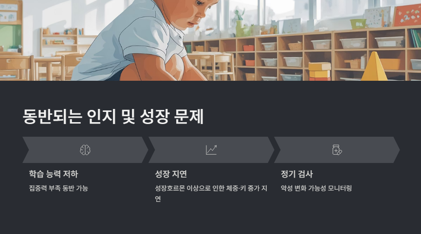 일부 환자는 학습 능력 저하나 집중력 부족을 겪기도 합니다. 성장호르몬의 이상으로 성장이 더디거나 체중이 적게 나가는 경우도 있습니다. 드물지만 종양이 악성으로 변할 가능성도 있어, 정기적인 검사와 관리가 중요합니다.