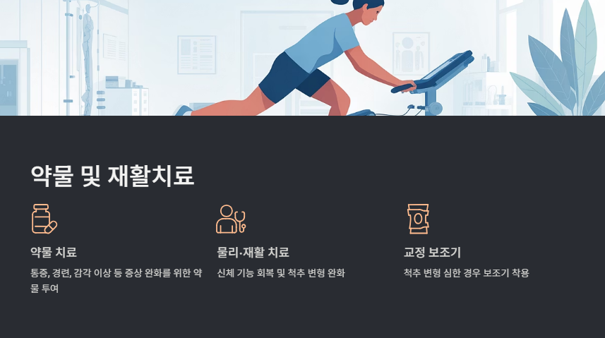 통증, 경련, 감각 이상 등 증상을 완화하기 위해 약물치료가 병행됩니다. 또한 물리치료와 재활치료를 통해 신체 기능을 회복할 수 있습니다. 척추 변형이 심한 경우에는 교정 보조기나 재활 프로그램을 이용해 증상을 완화하기도 합니다.