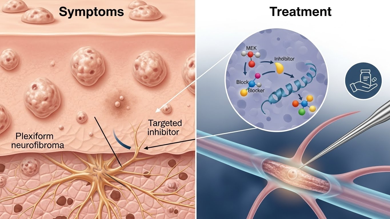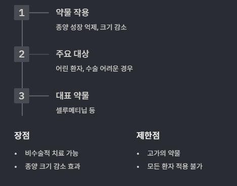 최근에는 표적 치료제(셀루메티닙 등)가 개발되어 일부 환자에게 좋은 효과를 보이고 있습니다. 이 약물은 종양의 성장을 억제하거나 크기를 줄이는 역할을 합니다. 특히 어린 환자에게 많이 사용되며, 수술이 어려운 경우 대체 치료법으로 활용됩니다. 다만 고가의 약물이며 모든 환자에게 적용되는 것은 아닙니다.