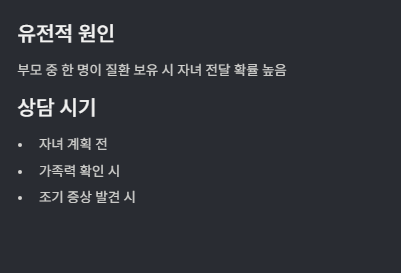이 질환은 유전적인 원인으로 발생하는 경우가 많습니다. 부모 중 한 명이 질환을 가지고 있다면 자녀에게 전해질 확률이 높습니다. 따라서 자녀 계획 전 유전 상담을 받는 것이 좋습니다. 이를 통해 발생 확률을 예측하고 조기 대응할 수 있습니다.
