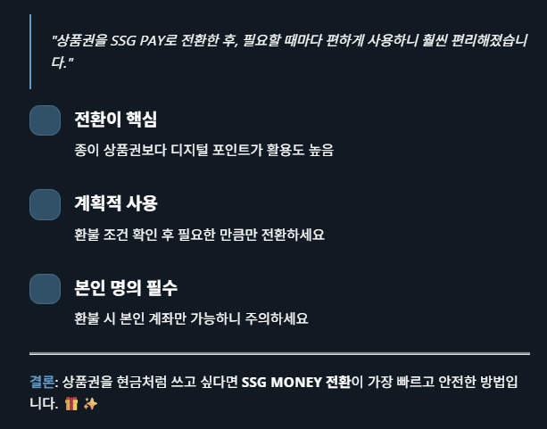 결론적으로 상품권을 스마트하게 쓰려면 전환 후 관리가 핵심입니다.