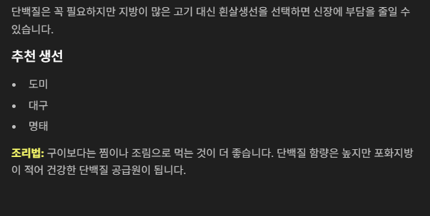 A. 염분이 많은 음식, 가공식품, 인스턴트, 고단백·고지방 식단은 피하는 것이 좋습니다.