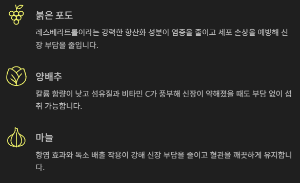 | 양배추 | 칼륨 낮음, 비타민 공급 |