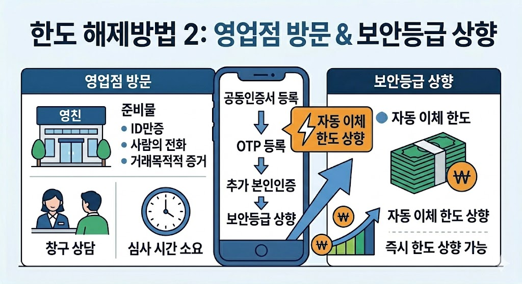 대규모 자금 이체가 필요한 경우 영업점 방문이 가장 확실합니다.