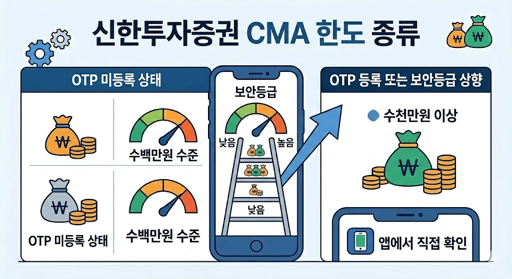 신한투자증권 CMA는 보안등급에 따라 한도가 달라집니다. 기본적으로 OTP 미등록 상태에서는 수백만원 수준으로 제한되는 경우가 많습니다.