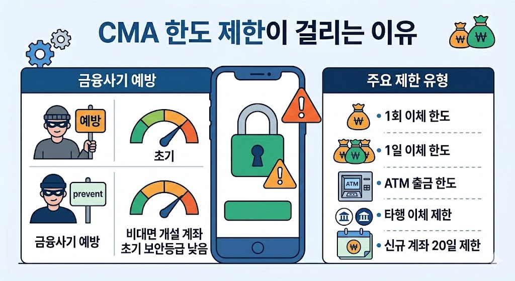 CMA는 입출금이 자유로운 계좌지만 금융사기 예방을 위해 일정 한도가 설정됩니다. 특히 비대면 개설 계좌는 초기 보안등급이 낮게 적용되어 한도가 제한됩니다.