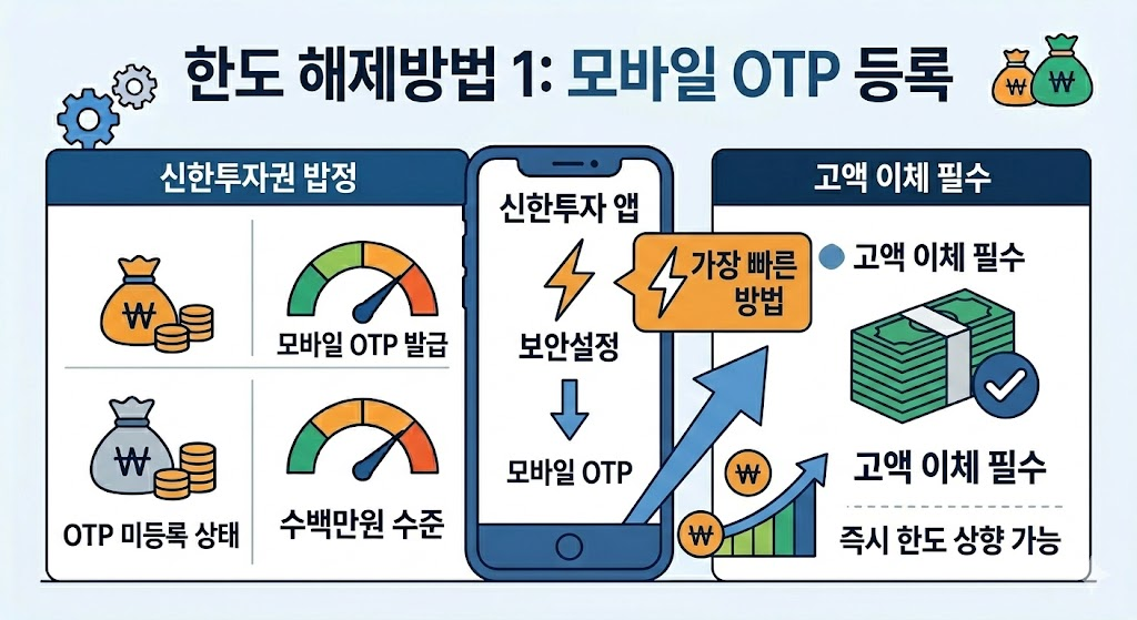 신한투자증권 CMA 한도 제한은 불편하게 느껴질 수 있지만 금융사고 예방을 위한 안전장치입니다. 특히 OTP 등록과 보안등급 상향이 가장 빠르고 확실한 해결 방법입니다.