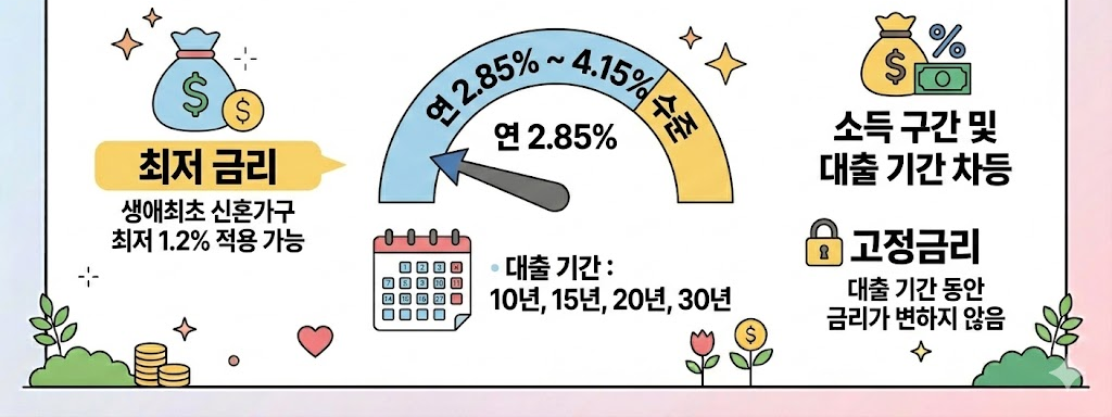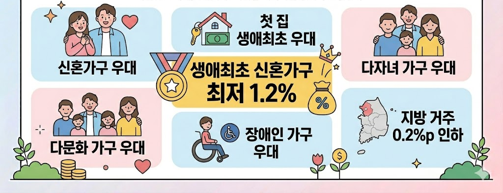 특히 생애최초 신혼가구는 최저 1.2%까지 적용되는 별도 우대금리 제도가 있습니다. 모든 조건을 충족해야 하며, 중복 적용 여부는 심사에 따라 결정됩니다.