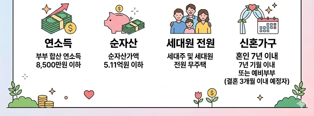 신청 대상은 단순히 신혼이라는 이유만으로 되는 것이 아니라, 소득과 자산, 무주택 요건을 모두 충족해야 합니다.
