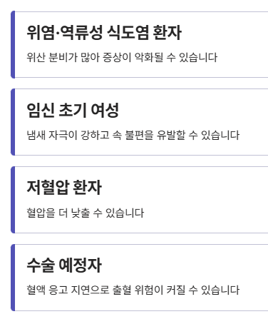 • ·역류성 식도염 환자 → 위산 분비가 많아 증상이 악화될 수 있습니다.