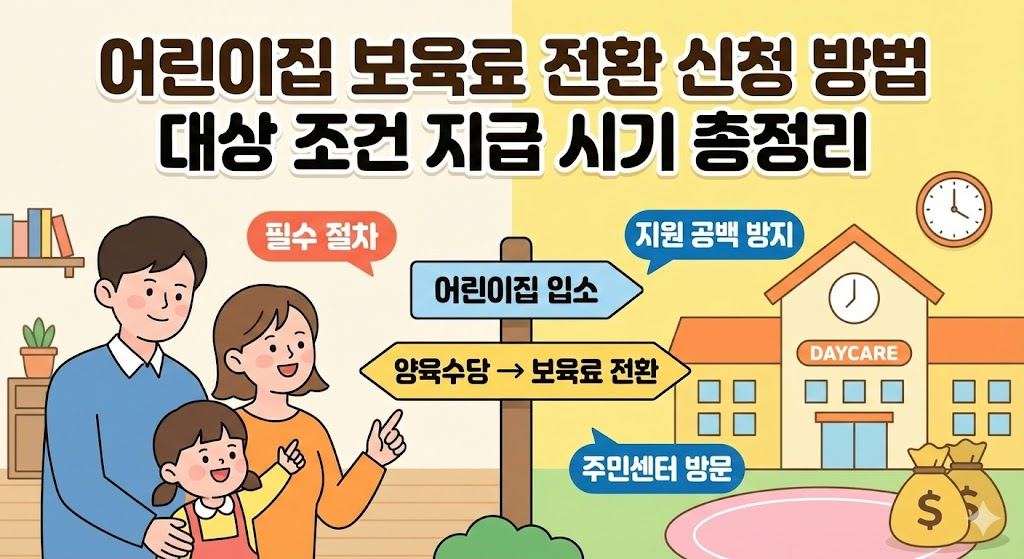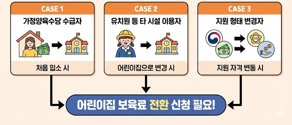 어린이집 보육료 전환은 가정양육수당을 받던 아동이 어린이집을 이용하게 될 때 정부 지원 방식을 변경하는 절차다.