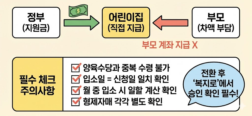 많은 부모가 입소 신청만 하면 자동으로 바뀐다고 생각하지만, 실제로는 별도의 신청 절차가 필요하다. 신청을 하지 않으면 양육수당은 중단되고 보육료는 바로 적용되지 않는 공백이 생길 수 있다.