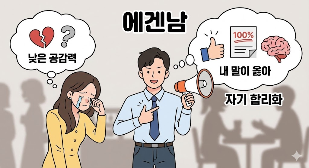 • “자기 잘못은 절대 인정 안 하는 스타일 = 전형적인 에겐남.”