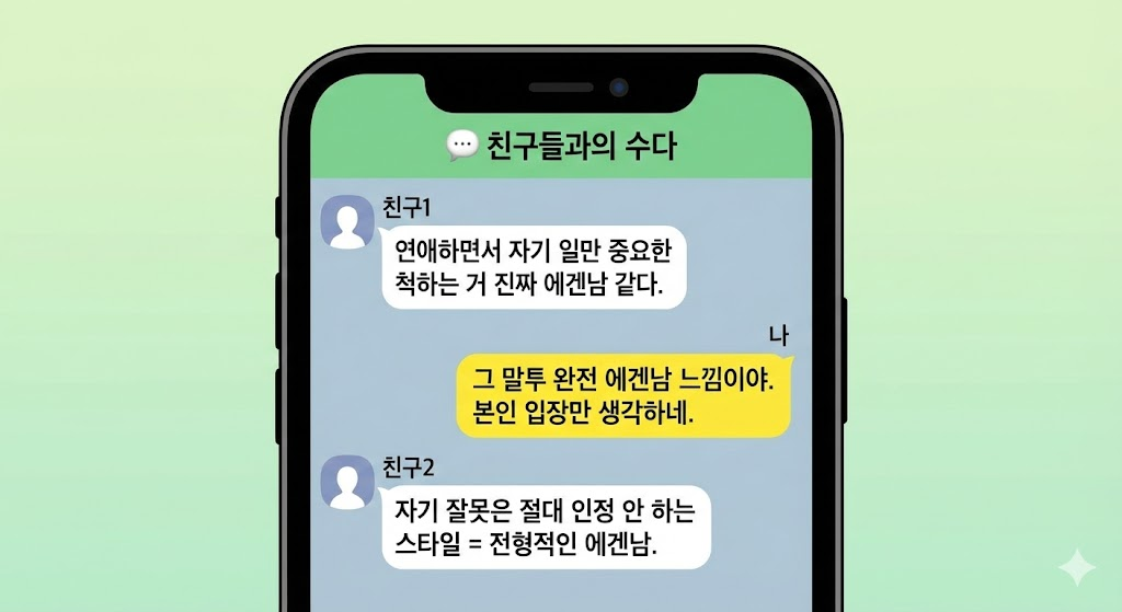 이 세 가지가 합쳐져 만들어진 단어가 바로 “에겐남”입니다. 대체로 대화나 연애 상황에서 자기 입장만 강조할 때 사용됩니다.