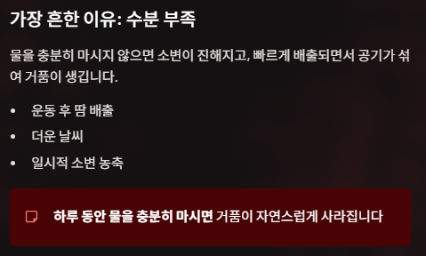 | 탈수 | 수분 부족 | 거품이 일시적, 금방 사라짐 | 수분 섭취 늘리기 |