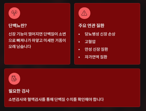 | 단백뇨 | 신장 기능 저하 | 거품이 오래 남음 | 혈액 검사 필요 |