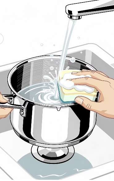 - 냄비 안쪽과 바깥쪽을 골고루 문질러 닦습니다.