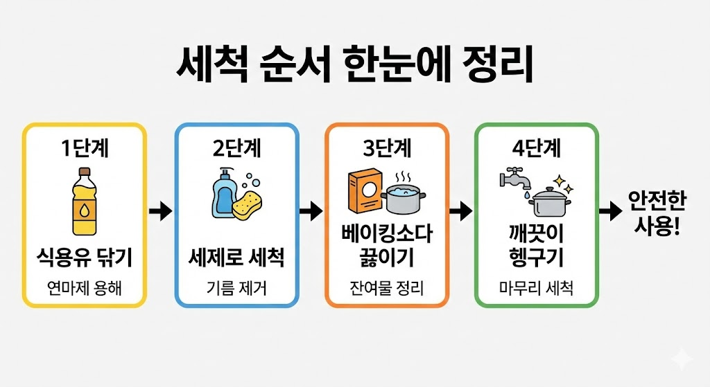 연마제 제거방법은 어렵지 않지만 순서를 지키는 것이 핵심입니다. 특히 식용유로 먼저 닦는 과정이 중요합니다. 새 제품을 바로 쓰고 싶어도 조금만 시간을 투자하면 훨씬 안심하고 사용할 수 있습니다. 한 번 제대로 해 두면 이후에는 마음 편하게 요리할 수 있습니다.