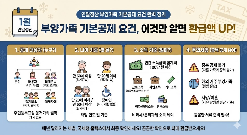 매년 1월이면 직장인들의 가장 큰 관심사는 바로 연말정산입니다. 그중에서도 가장 많은 질문이 나오는 항목이 바로 부양가족 기본공제 요건이에요. 누구를 공제 대상으로 올릴 수 있는지, 어떤 서류가 필요한지에 따라 환급액이 크게 달라지기 때문에 꼼꼼히 확인해야 합니다. 이번 글에서는 연말정산 부양가족 기본공제 요건을 중심으로 대상자, 나이·소득 기준, 중복 공제 주의사항까지 한눈에 정리했습니다.
