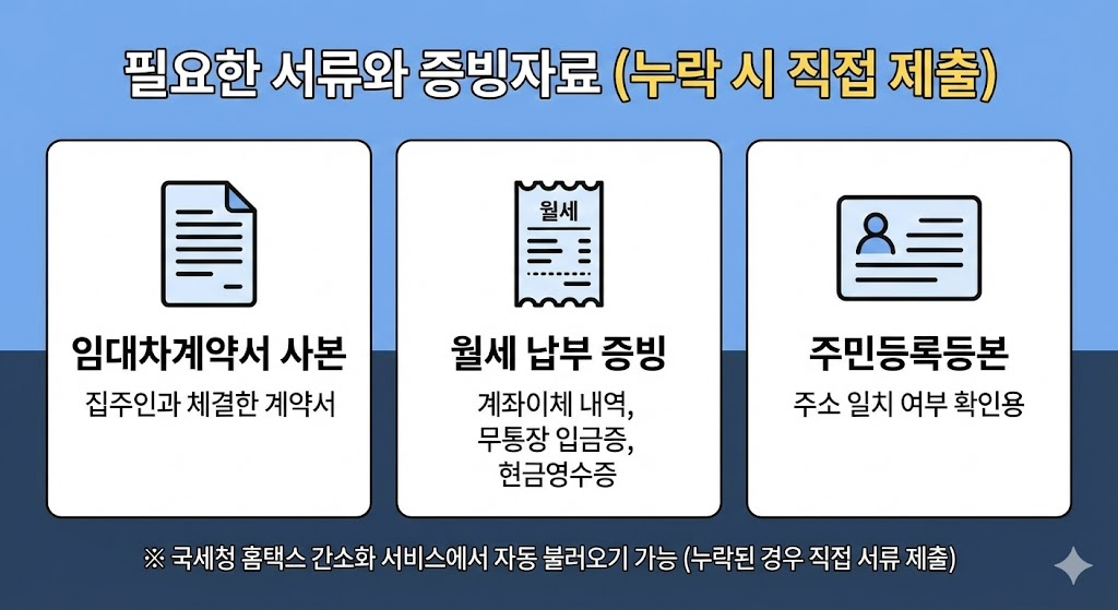 - 월세 납부 증빙 – 계좌이체 내역, 무통장 입금증, 현금영수증