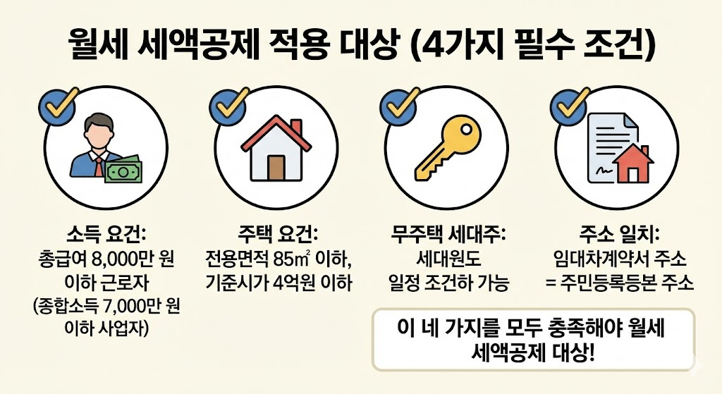 이 네 가지를 모두 충족해야 월세 세액공제 대상이 됩니다.