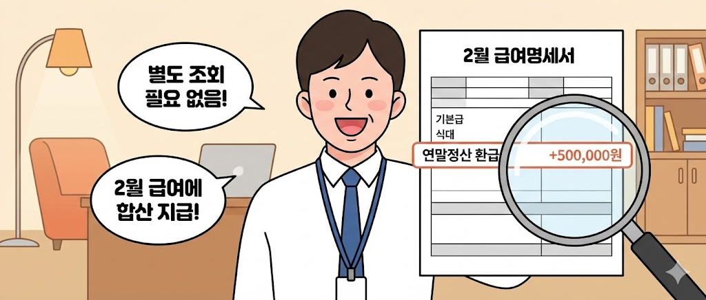대부분 직장인은 별도로 조회하지 않아도 된다. 2월 급여명세서에 ‘연말정산 환급’ 항목이 표시되는 경우가 많기 때문이다. 회사가 정산을 완료한 뒤 급여에 합산해 지급하는 구조다.