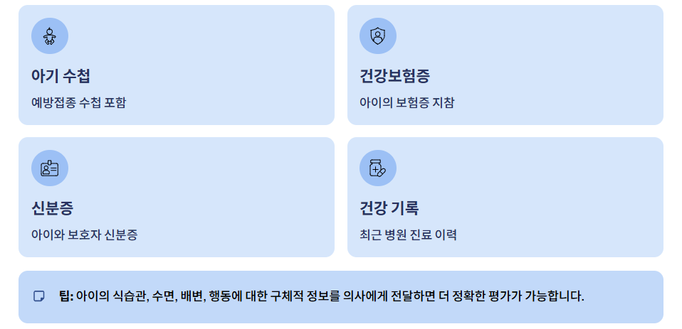 검진 시 의사에게 아이의 식습관, 수면, 배변, 행동 등에 대한 구체적인 정보를 제공하면 더욱 정확한 평가가 가능합니다.