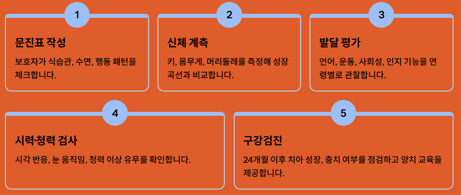 단순 신체검사 외에도 성장과 발달 전반을 평가하기 위한 항목으로 구성되어 있습니다.