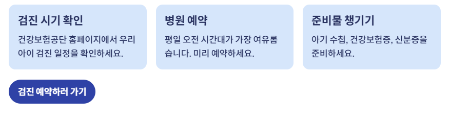 ※ 각 검진은 생후 월령 기준으로 진행되며, 기간 내에 받지 않으면 자동 소멸되므로 시기를 놓치지 않는 게 중요합니다.
