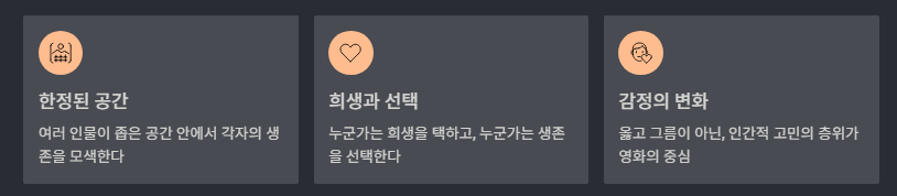 이야기는 한정된 공간 안에서 벌어진다. 여러 인물이 각자 생존을 위해 다른 결정을 내린다. 그러나 그 선택 뒤에는 인간적인 고민이 숨어 있다. 누군가는 희생을 택하고, 누군가는 생존을 선택한다. 단순히 누가 옳다 그르다의 문제보다, 그 감정의 변화가 영화의 중심이다.