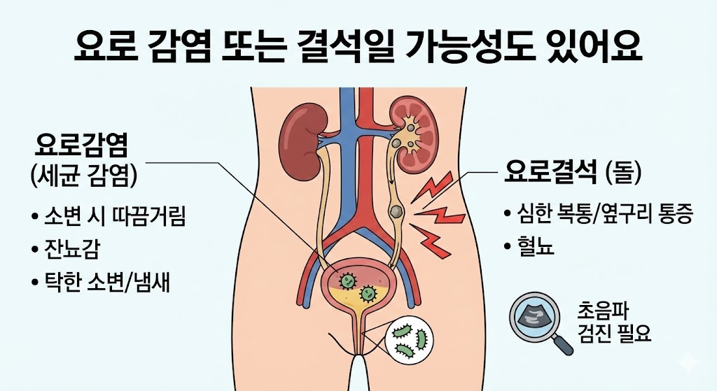 소변 시 痛症 , 잔뇨감 요로감염/결석 혈뇨나 허리통증 동반 가능