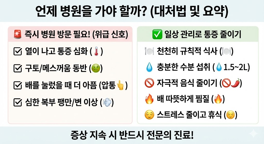 A. 통증이 하루 이상 지속되거나 열, 구토, 배변 이상 등이 동반될 경우에는 정확한 진단을 위해 병원 방문이 필요합니다.