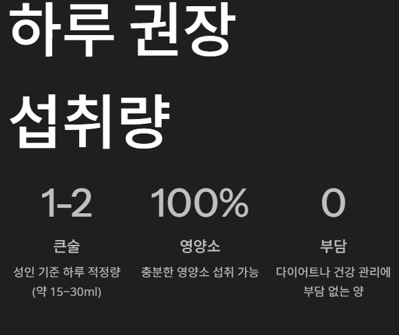 성인의 경우 하루 1~2큰술(약 15~30ml)이 적당합니다. 이 정도면 영양소는 충분히 챙기면서도 과하지 않아 다이어트나 건강 관리에도 부담 없는 양입니다.