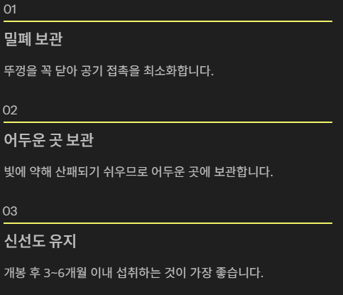 올리브오일은 공기와 빛에 약해 산패되기 쉬운 기름입니다. 뚜껑을 꼭 닫고, 어두운 곳에 보관해야 효능을 오래 유지할 수 있어요. 개봉 후에는 3~6개월 이내 섭취하는 것이 가장 좋습니다.