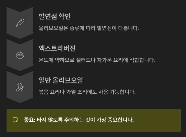 올리브오일은 종류에 따라 발연점이 다릅니다. 특히 엑스트라버진 올리브오일은 온도에 약하므로 샐러드나 차가운 요리에 적합합니다. 반면 일반 올리브오일은 볶음 요리나 가열 조리에도 사용 가능합니다. 타지 않도록 주의하는 것이 가장 중요합니다.
