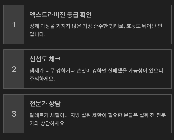 올리브오일도 제품마다 품질 차이가 큽니다. ‘엑스트라버진’ 등급은 정제 과정을 거치지 않은 가장 순수한 형태로, 효능도 뛰어난 편입니다. 냄새가 너무 강하거나 쓴맛이 강하면 산패됐을 가능성도 있으니 주의하세요.
