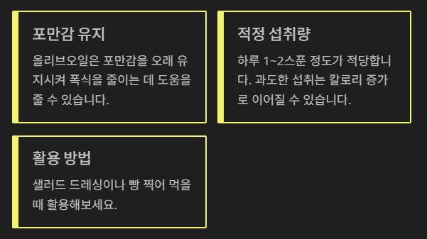 기름이 살을 뺀다니? 반대로 들릴 수 있지만, 올리브오일은 포만감을 오래 유지시켜 폭식을 줄이는 데 도움을 줄 수 있습니다. 다만 과도한 섭취는 칼로리 증가로 이어질 수 있으니 하루 1~2스푼 정도가 적당합니다. 샐러드 드레싱이나 빵 찍어 먹을 때 활용해보세요.