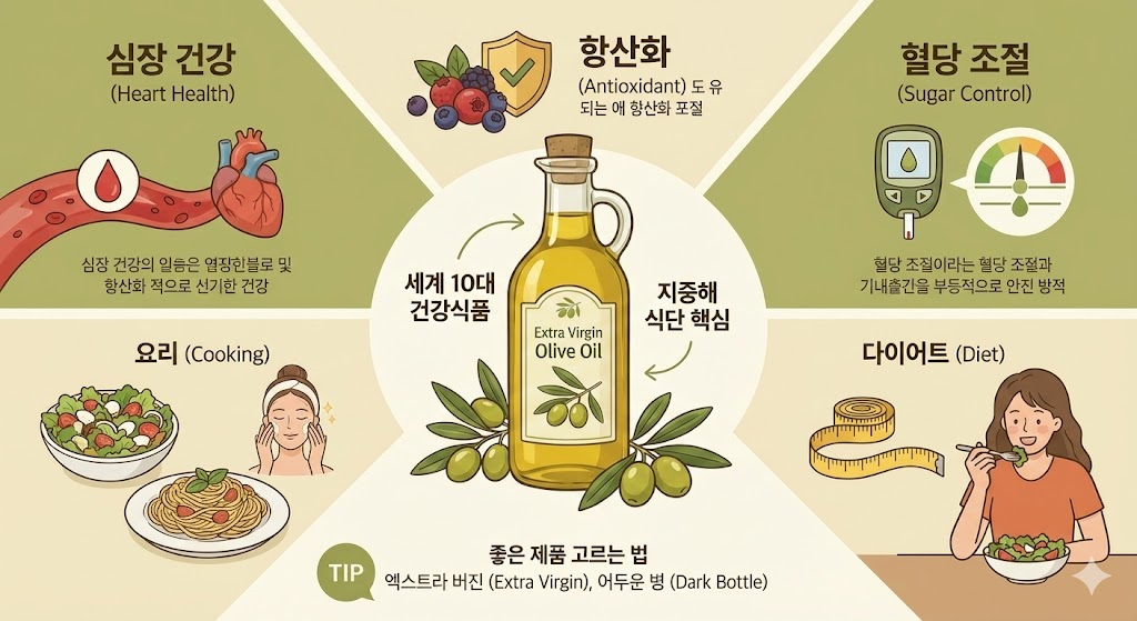 올리브유는 지중해 식단의 핵심이자 세계에서 가장 건강한 식용유 중 하나로 꼽힙니다. 요리뿐 아니라 피부관리나 다이어트에도 활용되는 만능 오일로, 심장 건강, 항산화, 혈당 조절 등 다양한 효능이 과학적으로 입증되어 있습니다. 오늘은 올리브유의 건강 효능부터 올바른 섭취법, 좋은 제품 고르는 법까지 자세히 살펴볼게요.