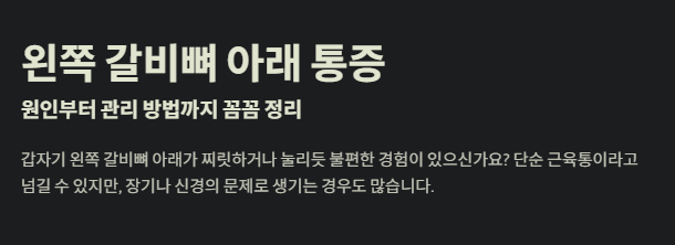 갑자기 왼쪽 갈비뼈 아래가 찌릿하거나 눌리듯 불편한 경험이 있으신가요? 단순 근육통이라고 넘길 수 있지만, 장기나 신경의 문제로 생기는 경우도 많습니다. 오늘은 왼쪽 갈비뼈 아래 통증의 주요 원인과 증상, 그리고 관리 방법을 자세히 알아보겠습니다.