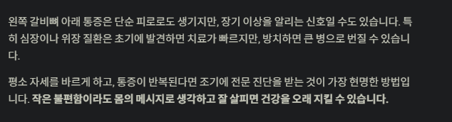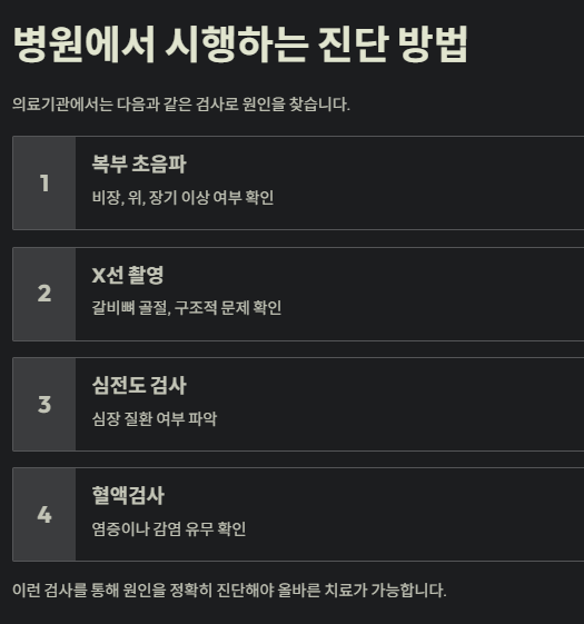 • 갑자기 심한 통증과 함께 식은땀이 난다면 → 심장 문제 가능성 (즉시 진료 필요)