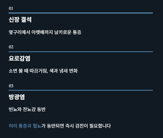 왼쪽 신장이나 요관에 결석이 생겼을 경우, 옆구리부터 시작해 아랫배까지 날카로운 통증이 퍼질 수 있어요. 소변 볼 때 따끔거리거나 색이 진해지고 냄새가 심해지면 요로감염 또는 방광염일 수 있습니다.