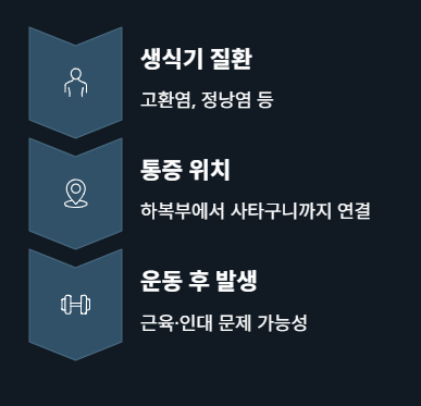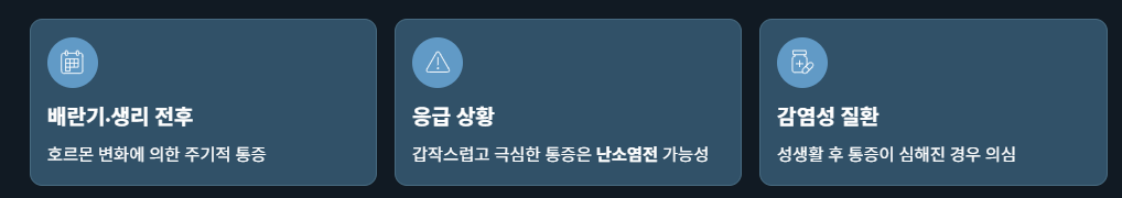여성의 경우 난소낭종, 자궁근종, 난관염 등의 질환과도 연관이 있을 수 있어요. 특히 배란기나 생리 전후에 통증이 반복되면 여성호르몬 변화에 의한 통증일 수 있고, 갑작스럽고 극심한 통증이 나타날 경우 난소염전 같은 응급상황일 수도 있습니다.