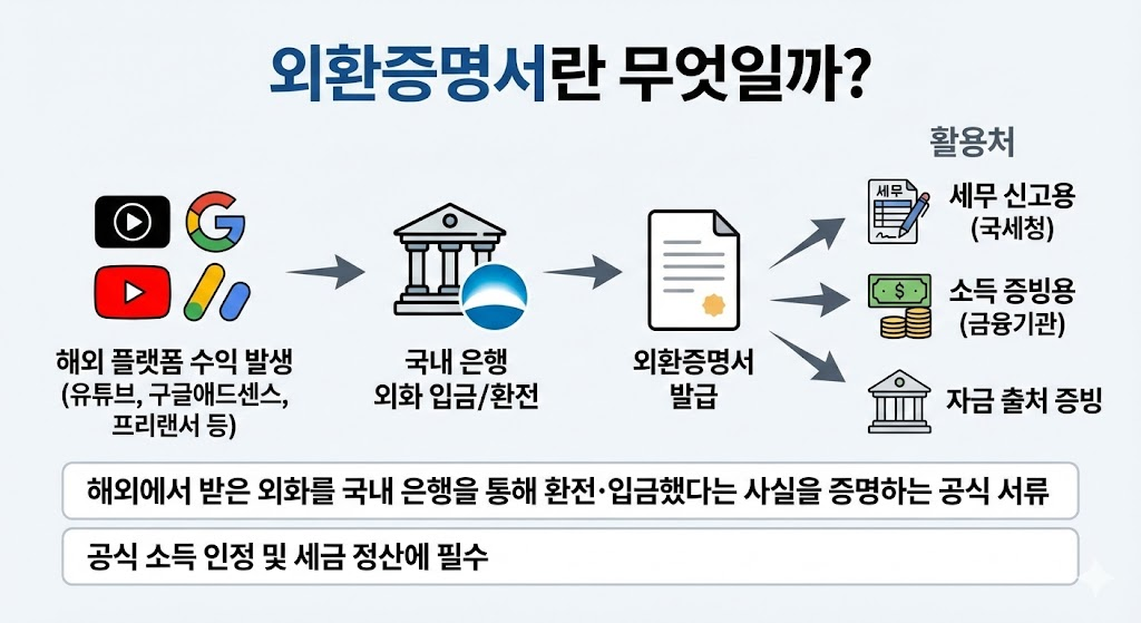 해외에서 받은 외화를 국내 은행을 통해 환전·입금했다는 사실을 증명하는 공식 서류입니다. 예를 들어 유튜브, 구글애드센스, 해외 쇼핑몰, 프리랜서 플랫폼 등에서 수익이 발생했다면, 세무 신고나 소득 증빙을 위해 반드시 필요한 문서이죠.