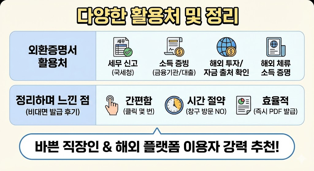 외환증명서는 단순히 세금 신고용뿐 아니라 다양한 곳에서 유용하게 사용됩니다.