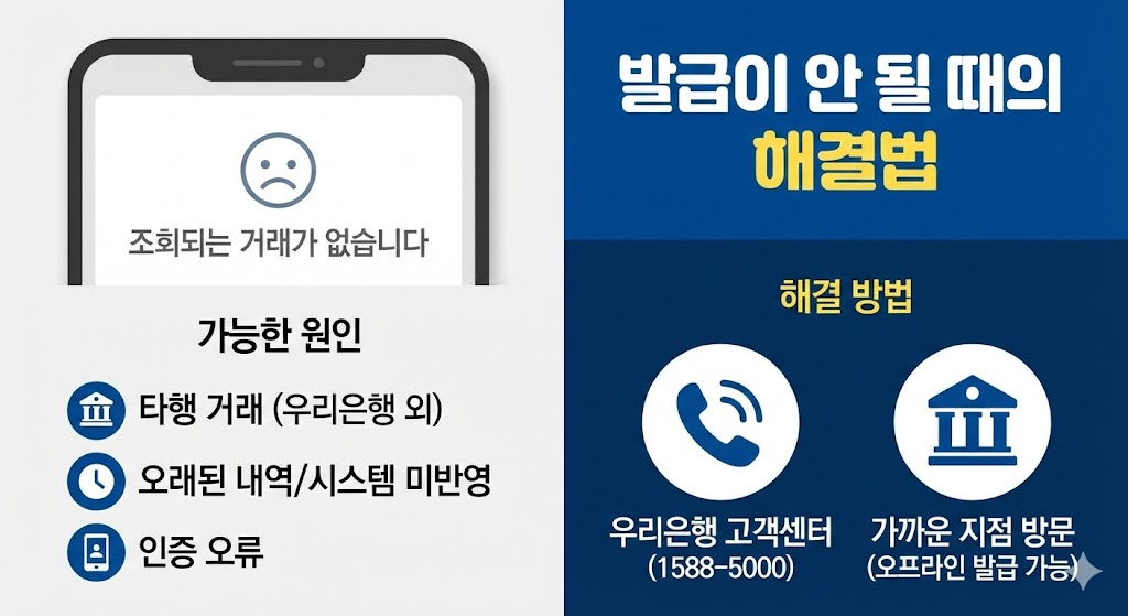 이때는 우리은행 고객센터(1588-5000) 로 연락하거나 가까운 지점을 방문하면 바로 해결할 수 있습니다. 비대면으로 처리되지 않는 경우에도 본인 확인만 되면 오프라인 발급이 가능합니다.