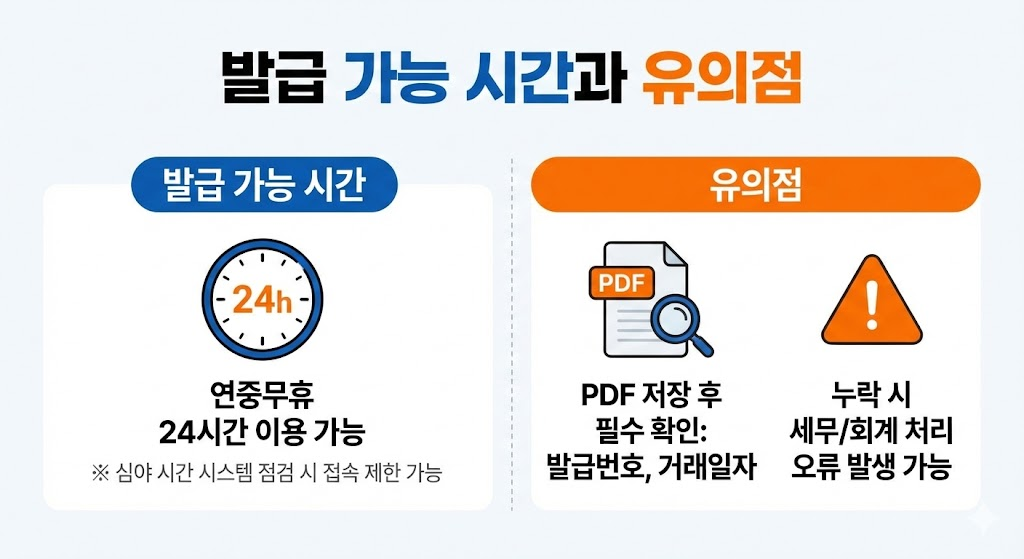우리은행 인터넷뱅킹은 대부분의 기능이 연중무휴 24시간 이용 가능합니다. 다만, 시스템 점검 시간이 있을 수 있으므로 심야 시간대에는 접속이 제한될 수도 있습니다. 이럴 때는 잠시 기다렸다가 다시 시도하면 문제없이 발급이 됩니다. 또한 PDF 저장 후에는 반드시 문서의 발급번호와 거래일자를 확인해야 합니다. 이 정보가 누락되면 세무서나 회계 처리 시 오류가 발생할 수 있습니다.