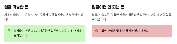 월급이나 사업소득처럼 일반 자금이 들어오면 압류방지 기능이 영향을 받을 수 있습니다. 그래서 사용 시 주의가 필요합니다.